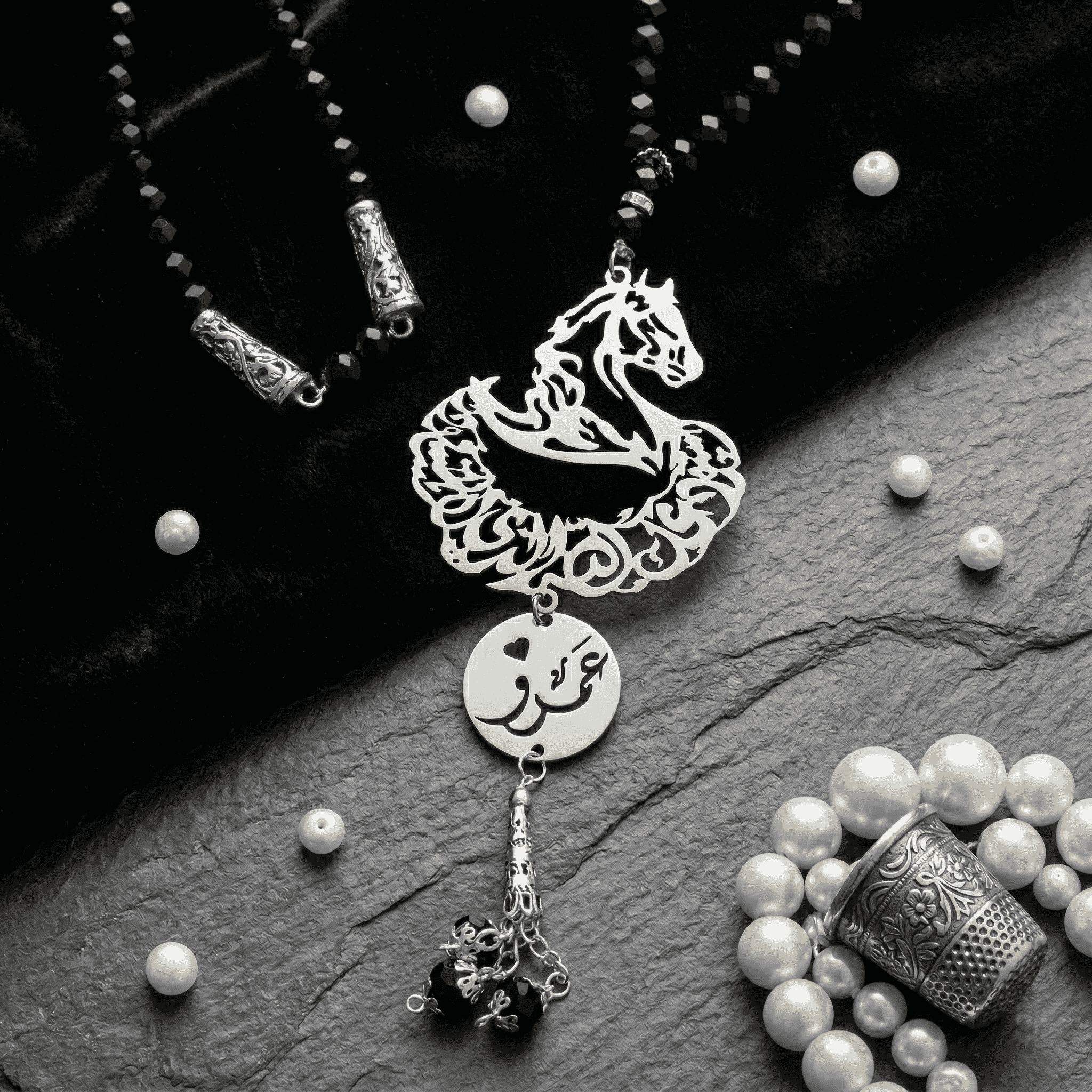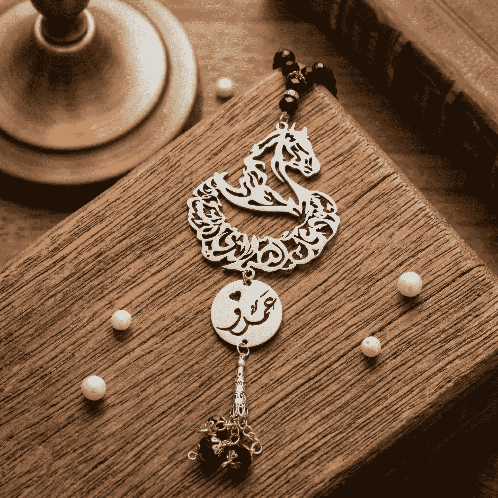 - تصميم يفيض بالمعاني: دلاية مستوحاة من صورة الحصان العربي، محفورة بتداخل فني مذهل مع الخط العربي الأصيل، مما يمنحها مظهراً ملكياً يجسد القوة والجمال.