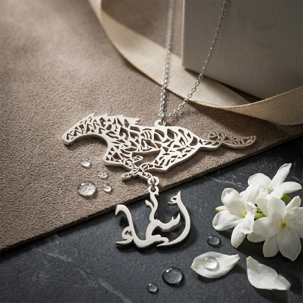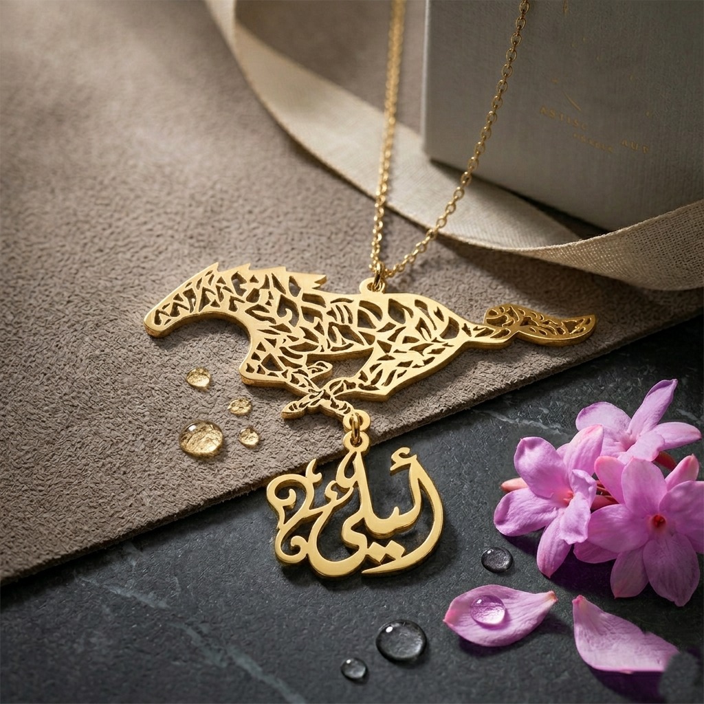 تجمع هذه القلادة الفريدة بين رمزية الخيل العربي الأصيل، الذي يعكس القوة والجمال، وبين الخط العربي الذي يضفي لمسة شخصية لا تُنسى. صُممت خصيصاً لمن يبحث عن قطعة مجوهرات تروي قصة وتعبّر عن التفرد.
